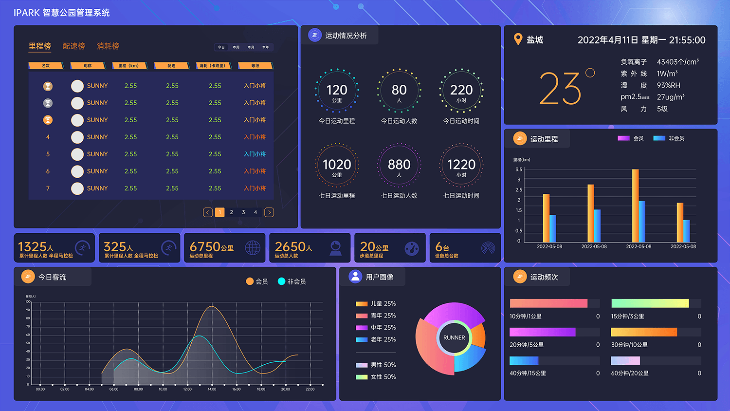 智慧步道终端显示设备,通过数据集成运算,展示运动配速、里程排名、热量消耗等信息的统计分析。用户可通过AR人脸识别进行会员注册、信息查询等。